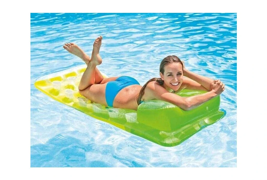 Een Intex 18-pocket luchtbed staat garant voor comfort. Dit bijzonder stevige luchtbed in de kleur groen heeft een doorzichtige bovenzijde met een gekleurde onderzijde.
