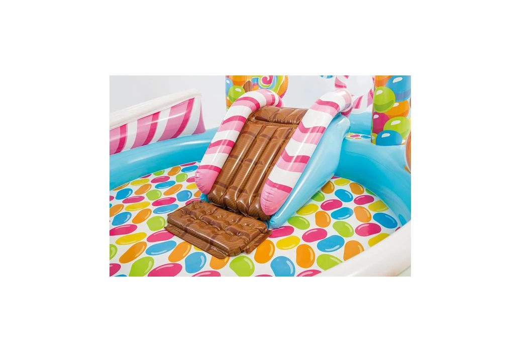 Urenlang speelplezier met dit Candy Zone speelbad van Intex! Het zwembadje is 2,95 x 1,91 x 1,30 meter groot en bestaat uit een groot en klein deel. Het grote deel heeft een capaciteit van 206L, en het kleine deel heeft een capaciteit van 168L.