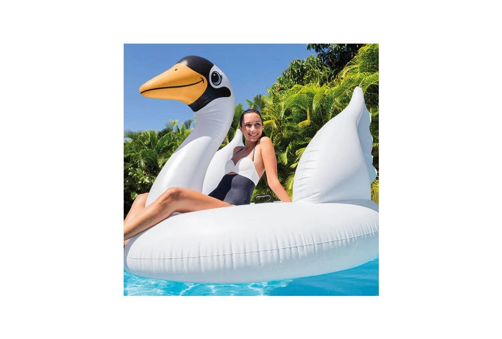 Drijf mee op de rug van deze grote zwaan en geniet van het samen spelen in het zwembad.
