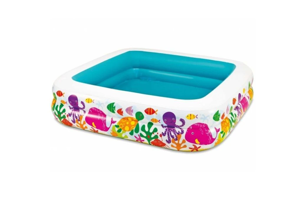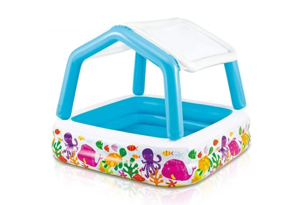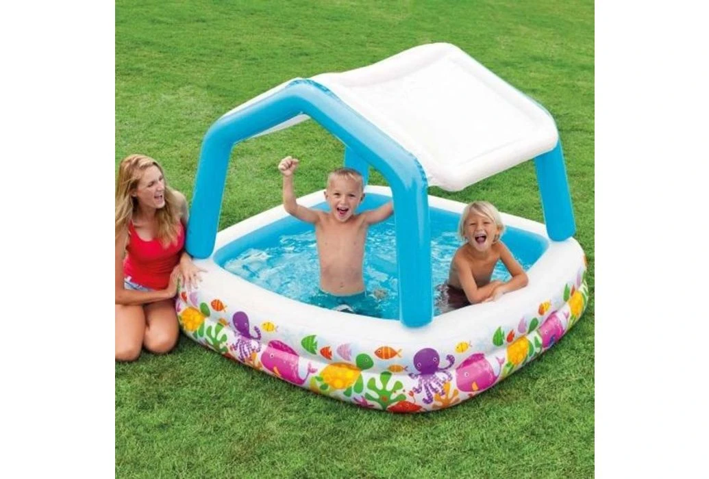 Dit opblaasbare vissenbad van Intex beschikt over een opblaasbaar zonnedak wat ervoor zorgt dat je kind lekker in het water kan spelen in de schaduw.